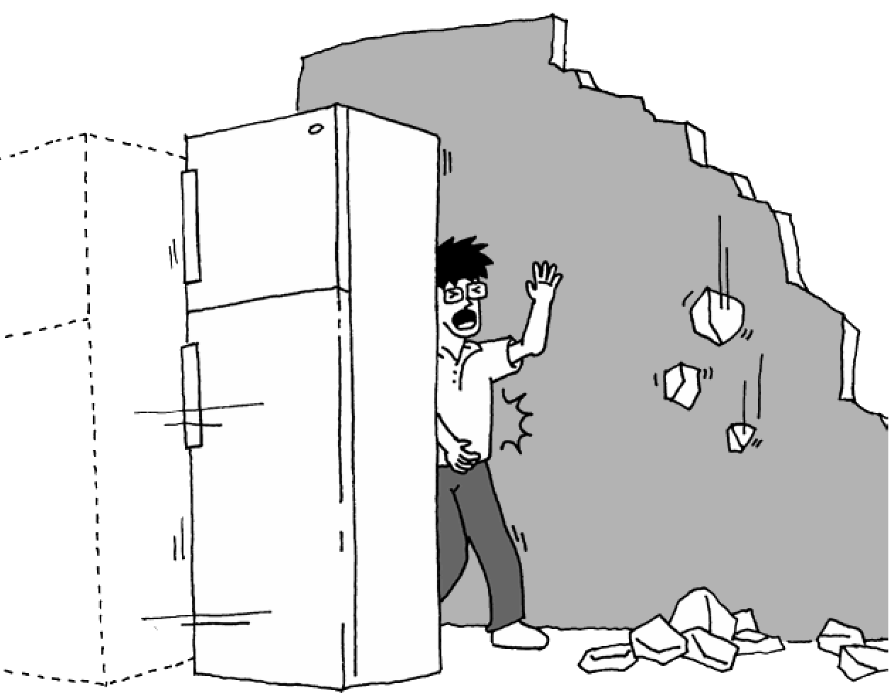 在地震發生時,無法預知地震搖晃的方式、物品或建築物倒塌的方向,就無法預知何處會產生所謂的地震「生命黃金 三角」空間。而最常發生的現象是在地震高能量搖晃下,使原本自我預期可能產生的生命黃金三角空間,因家具或物品的橫 向位移而完全消失,造成人員受物品擠壓或碰撞而受傷。