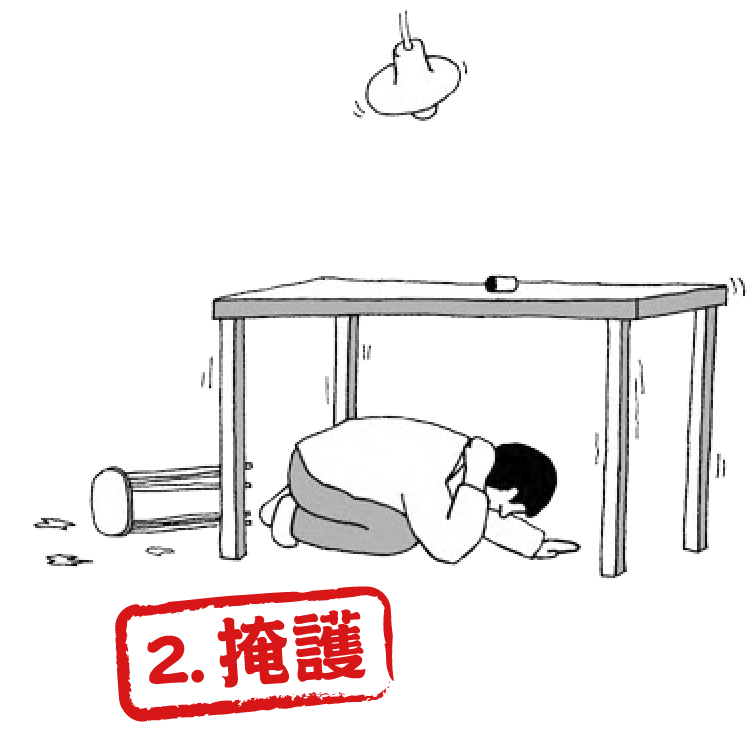 註:上圖動作引自美國抗震減災資訊網: http://www.shakeout.org/ 遇地震時以此為防震原則,但仍需視現場環境及身邊物品調整動作,達到保護自己的目的。