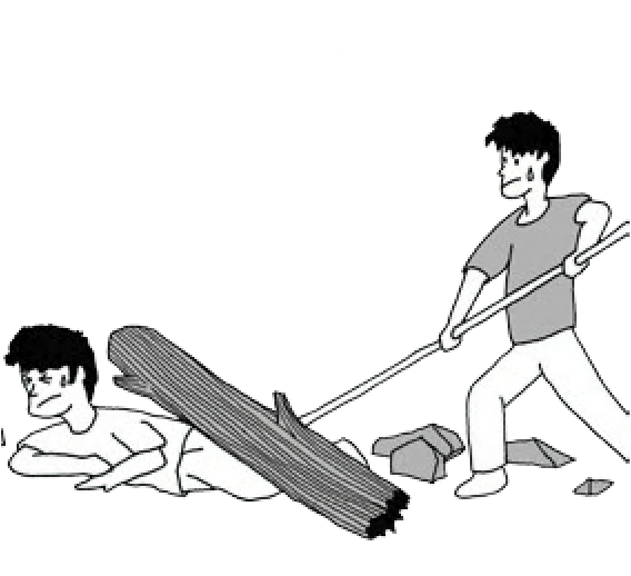 當發現有人遭重物壓住時,在不危害自身安全的情形下,呼喊其他人一起來救助,對患者要加以鼓勵,給予心理支持。運用智慧使用周遭的物品,撐起物體協助脫困。
