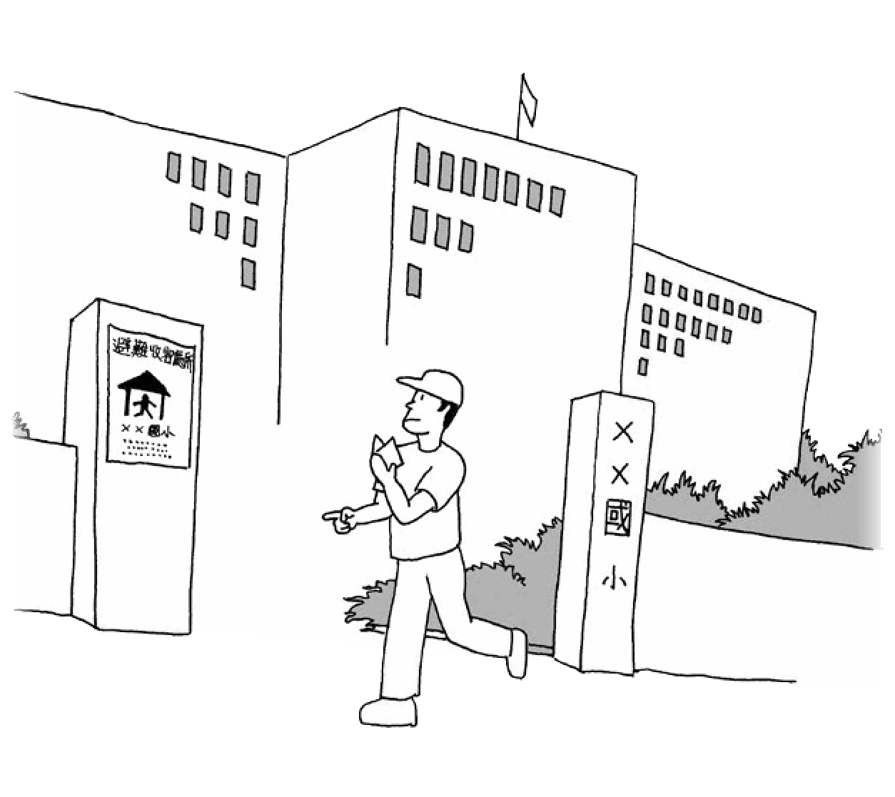 清楚知道居住地行政區規劃之防災公園,或防災任務優先開設學校位置,並至避難收容處所勘查實地情形及出入口方位,另外應該多留意住家周圍可供集合或是避難的場所, 作為臨時備案,才能在災害發生時應變及避難。