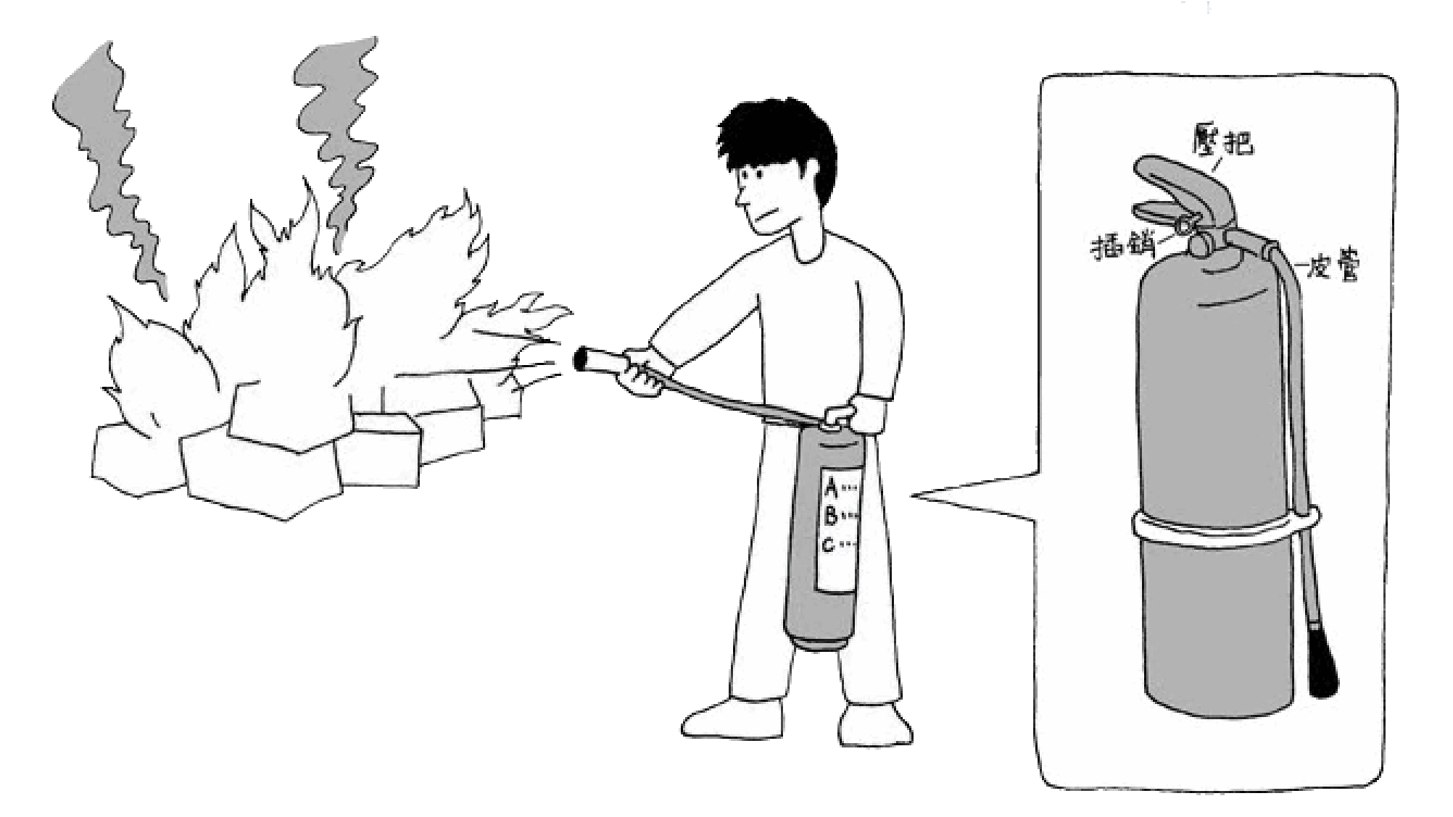 ⑤左右掃射,將起火物覆蓋上乾粉使用滅火器噴出時為高壓性,可能造成燃燒物之飛濺, 使滅火人員受傷,應保持適當距離