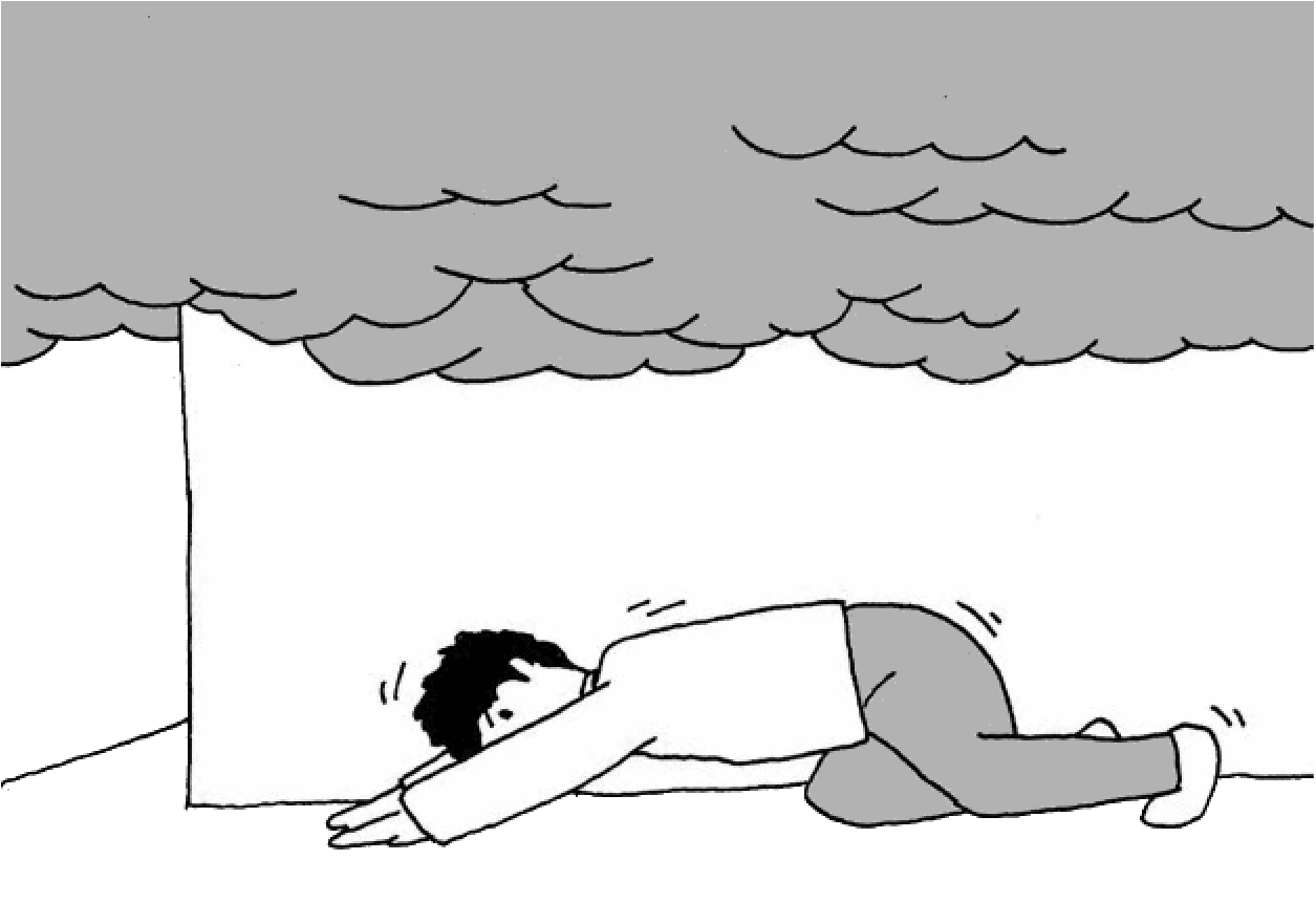 盡量將身體壓低,頭部避免抬高,以跪姿雙手爬行方式進行逃生,避免煙層下降高熱導致受傷;但並非所有火災狀況都必須使用此逃生動作,如在煙層不明顯或無溫度等允許狀況下盡可能快速進行逃生,另外勿浪費時間尋找濕毛巾, 以免延誤逃生時機。( 詳細資訊參考→ p.224 至 p.226)