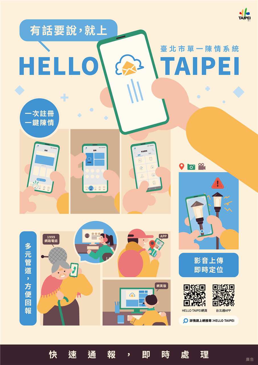 親愛的市民朋友,您有市政問題要反映嗎?歡迎使用台北通App「服務」項目「有話要說」反映寶貴意見,立案時可節省個資登載時間,並可追蹤案件辦理進度。或利用App撥打1999網路電話諮詢,不再受限撥打地點,皆可聯繫臺北市政府,省時又便利。