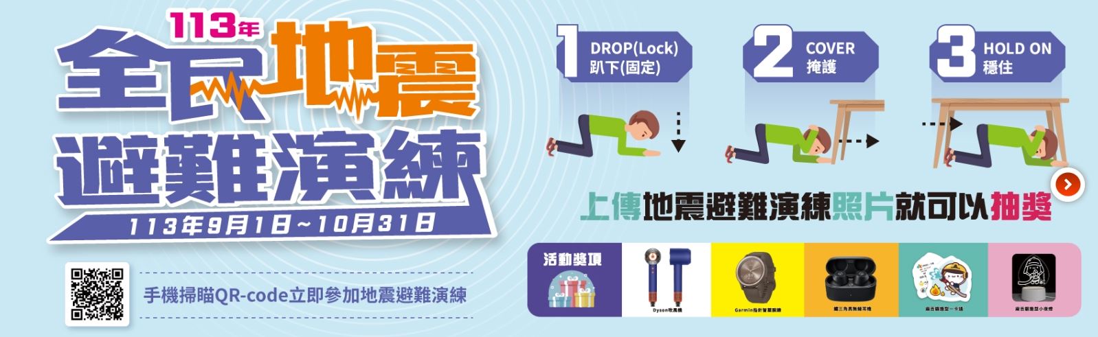(二)活動內容:113年9月20日上午9時21分,由交通部中央氣象署發布「國家防災日地震警報」訊息,即進行自主性就地避難演練(趴下Drop、掩護Cover、穩住Hold on),並於10月31日前將演練照片上傳至「消防防災館」,即可抽Dyson吹風機、Garmin指針智慧腕錶、鐵三角真無線耳機等大獎。
