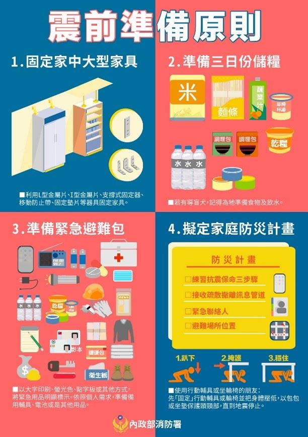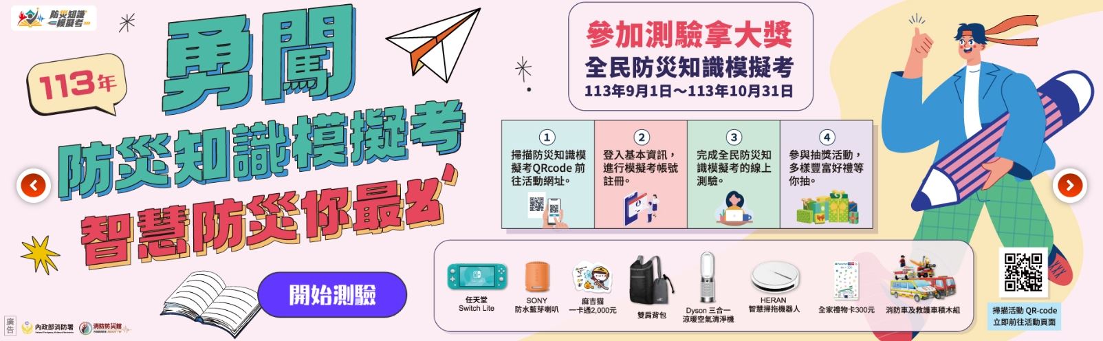 為建立全民正確防災知識,宣導民眾加強地震平時防災準備,9月份於消防署「消防防災館」(https://www.tfdp.com.tw/cht/index.php)辦理一系列地震防災宣導活動,提升全民地震防災意識,達全民防災參與之目的。