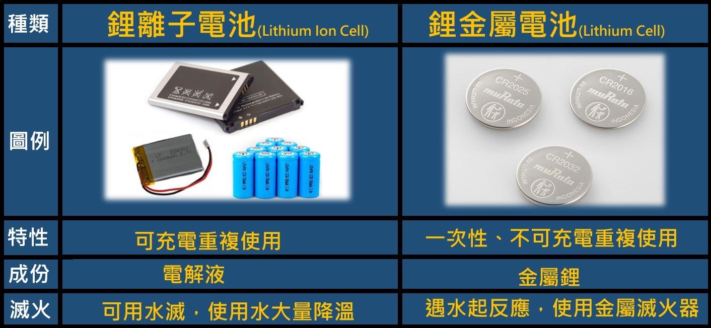 鋰電池起火後容易有爆炸現象,最有可能是撒水時,鋰電池正好爆炸,鋰金屬碰到水會產生氫氣,但鋰離子電池的成分是電解液,並不會與水反應,如果是「不可充電」的鋰金屬電池(Lithium Cell),那起火後就屬D類金屬火災,需使用金屬火災滅火器來滅火。