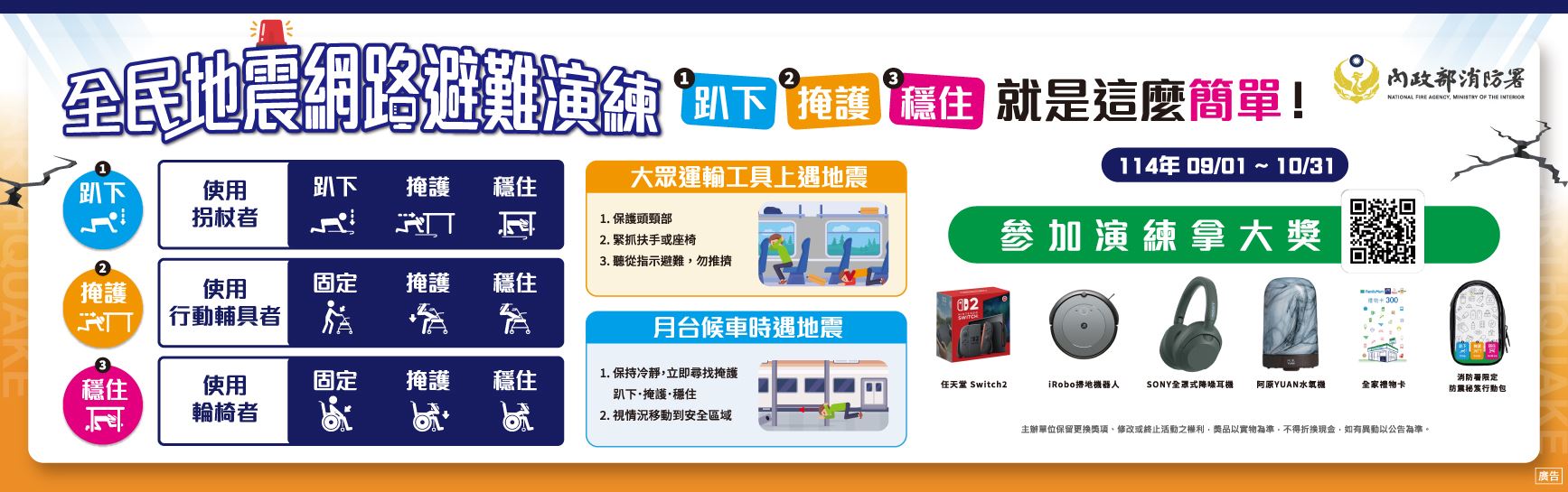(二)活動內容:114年9月19日上午9時21分,由交通部中央氣象署發布「國家防災日地震警報」訊息,即進行自主性就地避難演練(趴下Drop、掩護Cover、穩住Hold on),並於10月31日前將演練照片上傳至「消防防災館」,即可抽任天堂Switch2、iRobot掃地機器人、SONY全罩式降躁耳機等大獎。