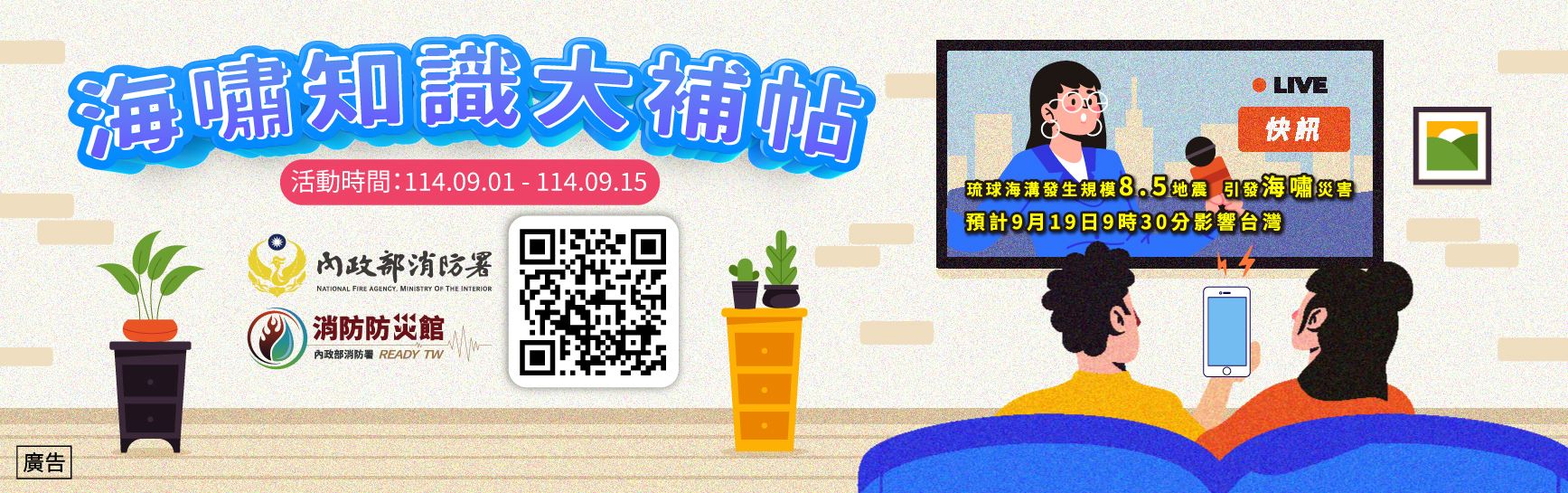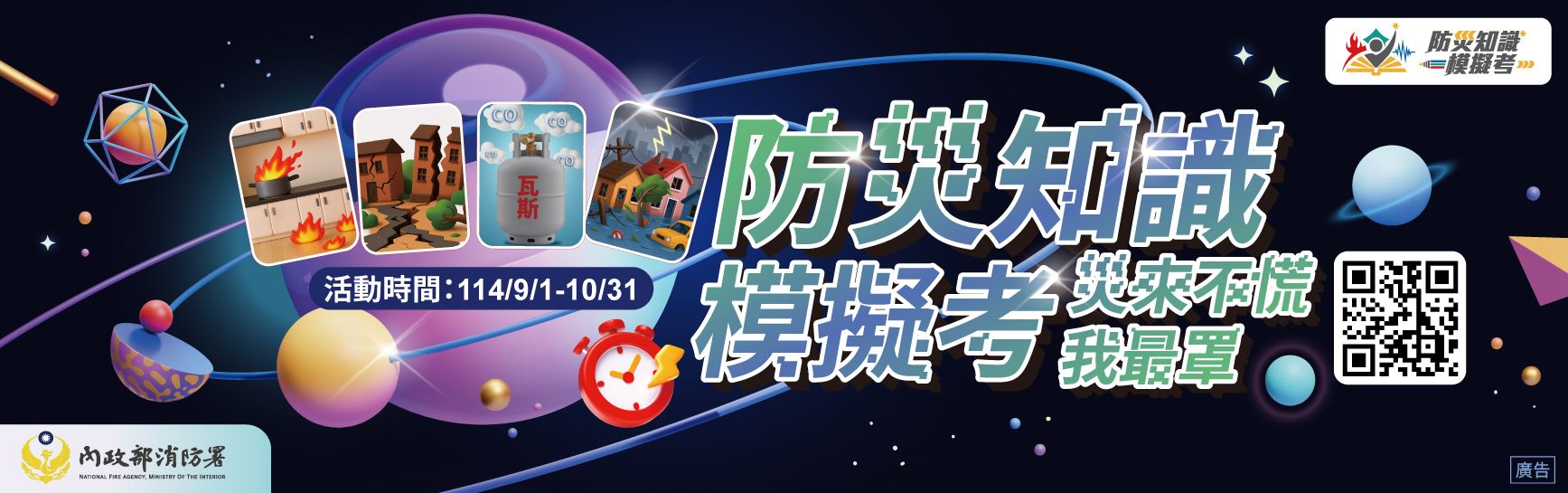 為建立全民正確防災知識,宣導民眾加強地震平時防災準備,9月份於消防署「消防防災館」(https://www.tfdp.com.tw/cht/index.php)辦理一系列地震防災宣導活動,提升全民地震防災意識,達全民防災參與之目的。