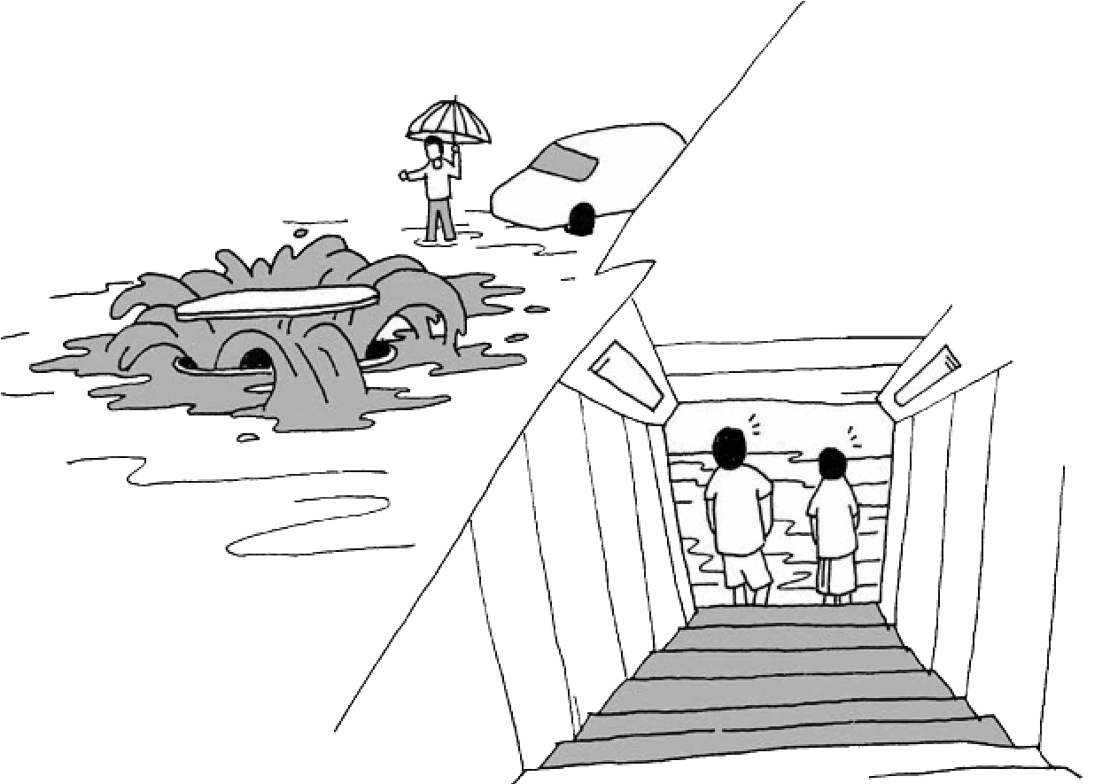地下人行通道或比路面低的隧道等,在豪雨中易淹水,請勿從該處通過。