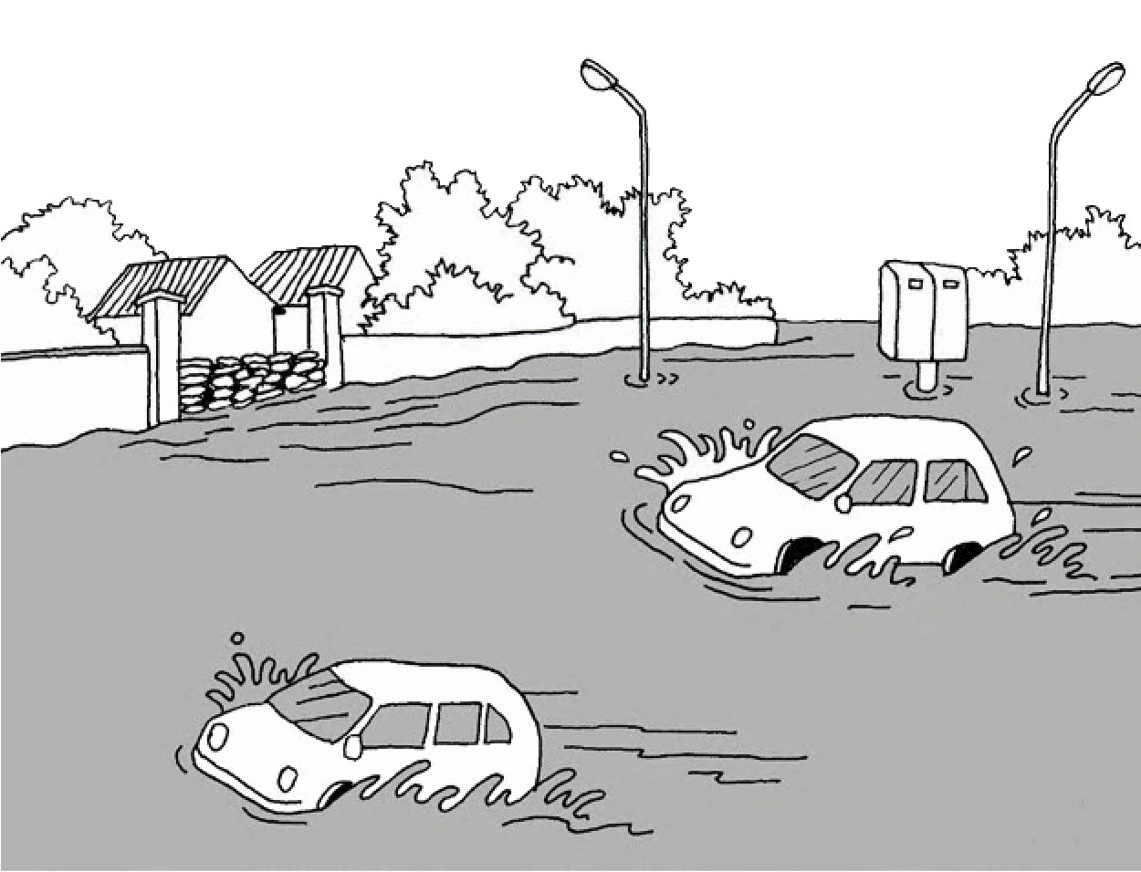 淹水的道路上,排水溝蓋可能有脫落危險,萬不得已要在淹水的地方移動時,要用傘等物品一邊探索一邊移動。
