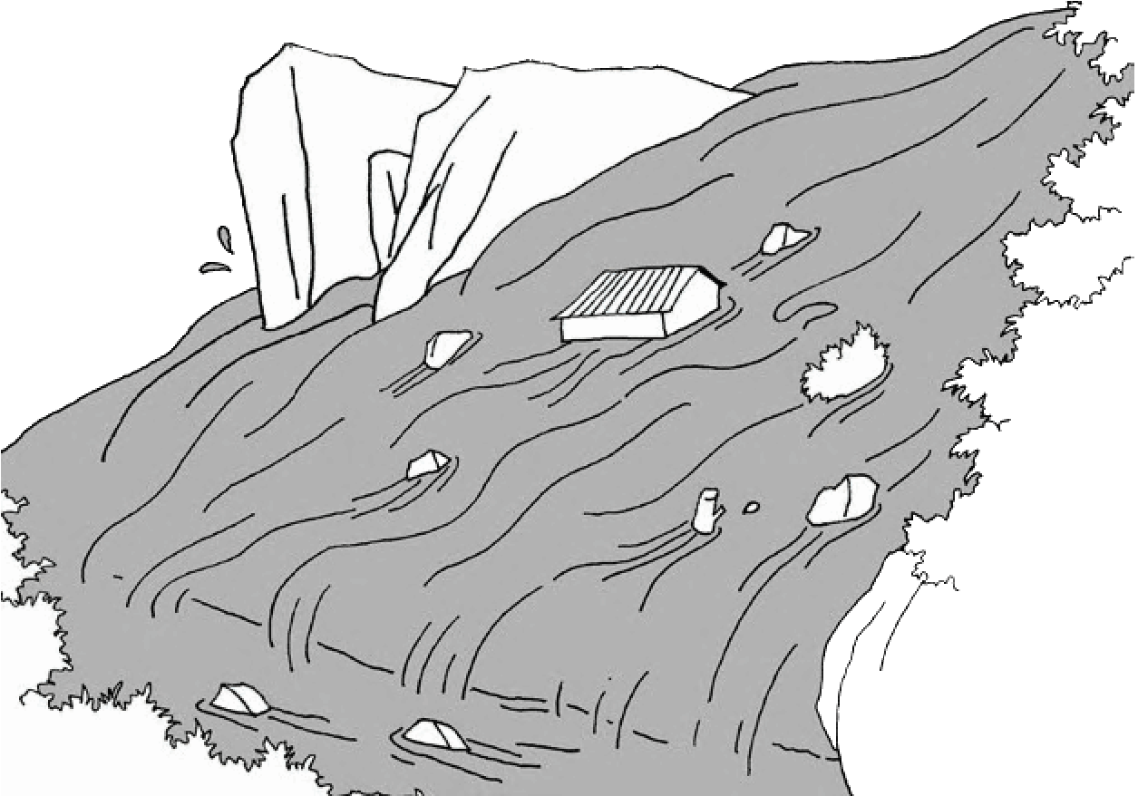 坡地和山區要注意土石流災害的發生,發現土石流前兆時,為確保安全,以先行避難為原則。 ( 詳細資訊參考→ p.237)