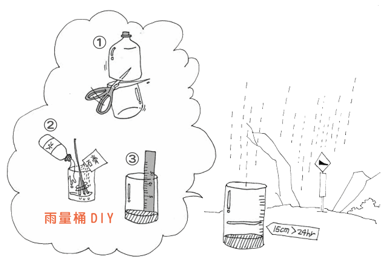 注意: 下雨時可將雨量桶移至戶外觀測累積雨量,當 24 小時超過15公分,應加強注意。