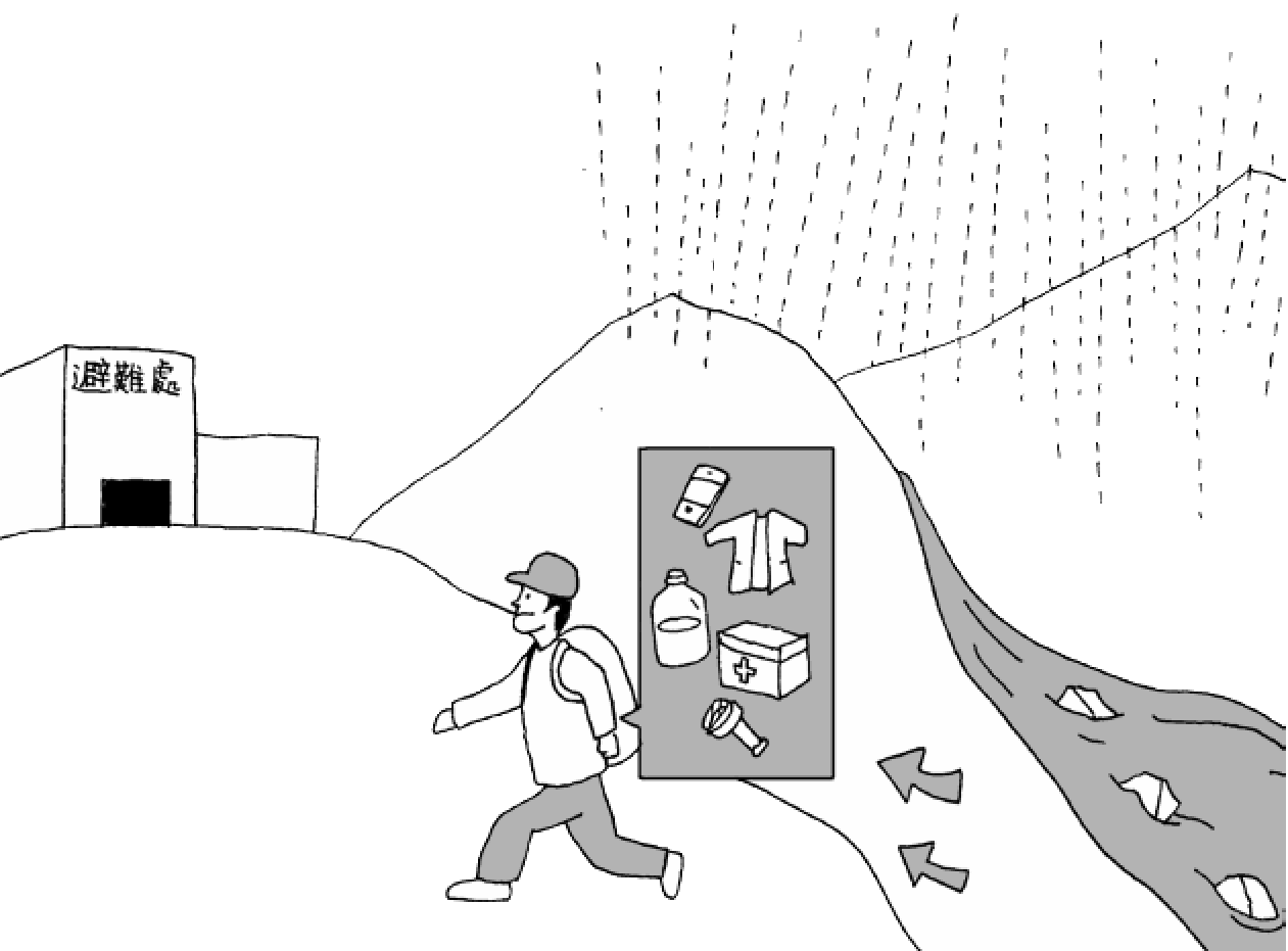 ①察覺到危險時換上容易活動的服裝,攜帶防災避難包 ( 備妥物資,如雨具、保暖衣物、飲用水、手電筒、收音機等 ), 儘量少帶東西,空出雙手,準備撤離。
