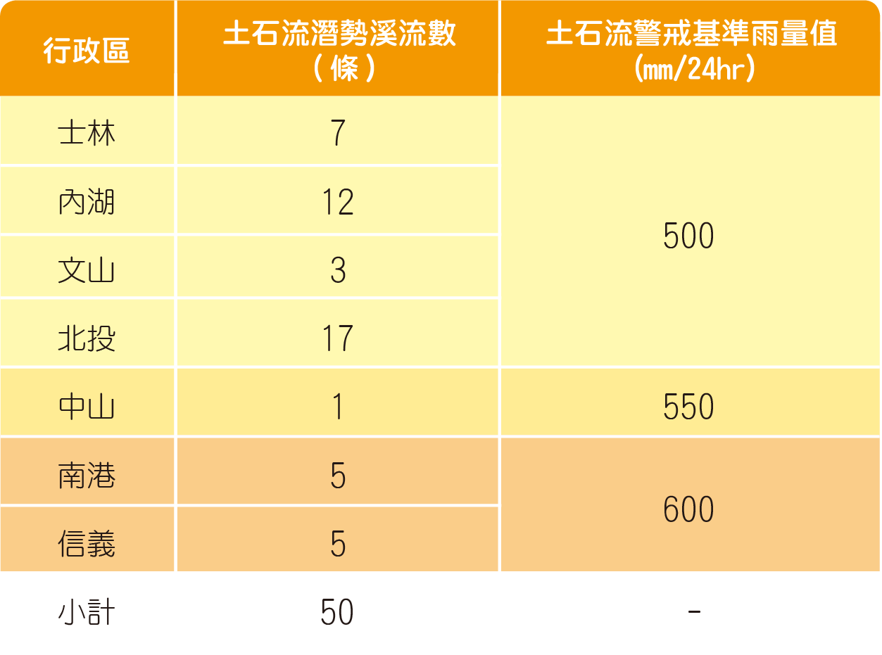 本市共計50條土石流潛勢溪流分布於 7 行政區,土石流潛勢溪流可至土石流及大規模崩塌防災資訊 (https://246.swcb.gov.tw/ ,詳細資訊參考→ p.238)