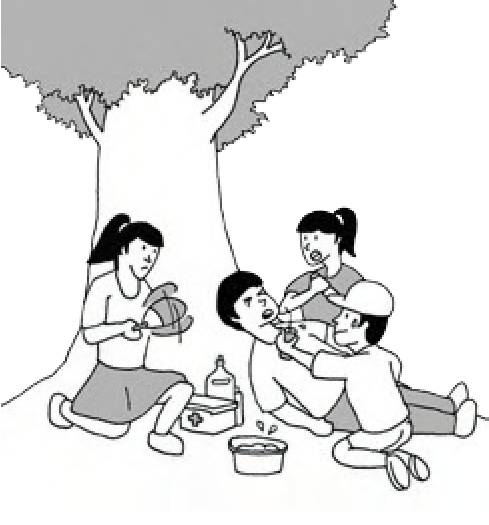 出現熱傷害的症狀,應儘快移動 到陰涼遮蔽處、鬆脫身上衣物,用濕毛巾擦拭身體,若意識清楚,可飲用含少許鹽分的冷開水或稀釋之電解質飲料,儘速就醫。( 詳細資訊參考→ p.191 至 p.192)