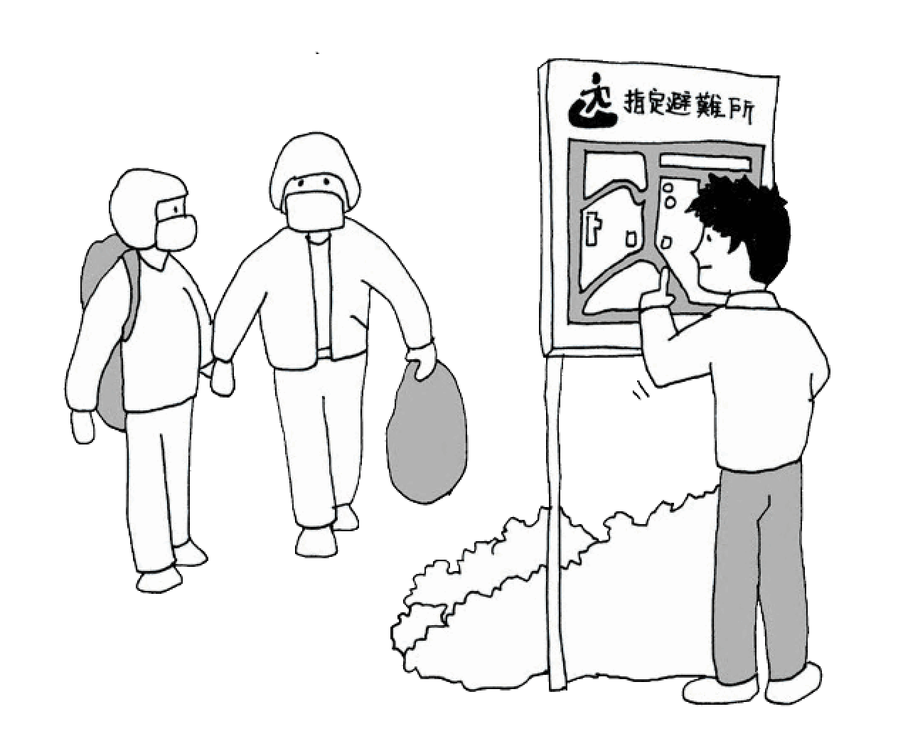 ①在防災地圖上確認危險潛勢區,事先確認危險區域和避難路線及避難所。 ( 詳細資訊參考→ p.255)