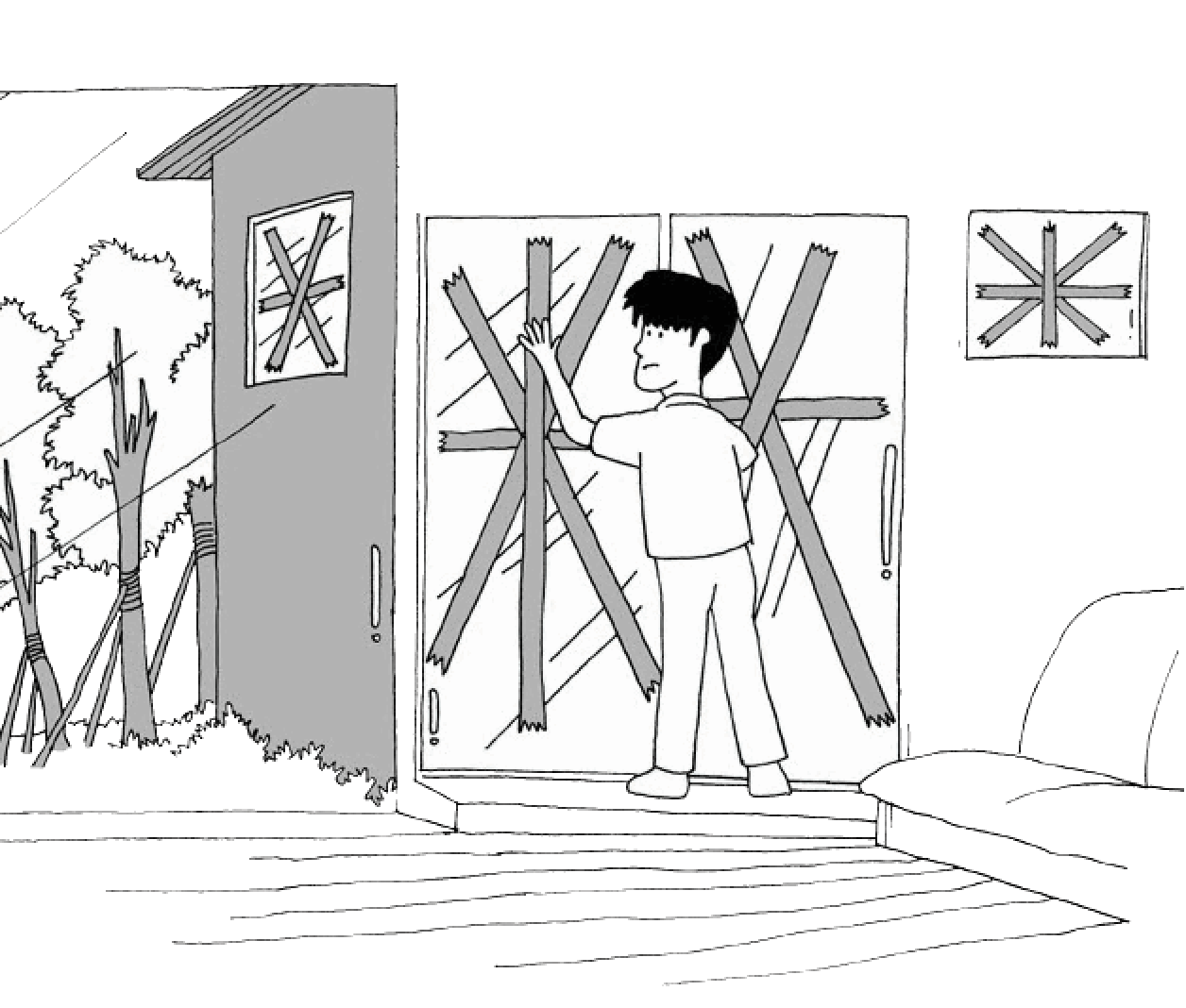 檢視並維修牢固家中所有的門窗,盆景移至室內,花木事先用支架保護,其他物品如曝露於室外之電線等應加強牢固,以免被風吹落,引起災害或變成傷人利器。