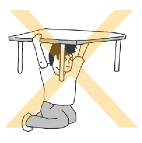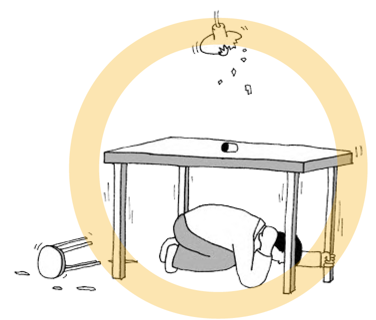 The primary safe emergency evacuation location for people is the solid table because it can provide space for people to hide in it. If you can't find a solid table then the building wall pillar would be your second option. In addition, remember to use your personal belongings to protect the head from being injured.