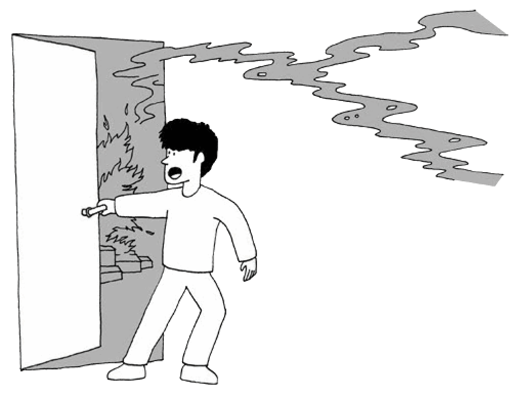 If you cannot identify the accurate position of the fire, quickly feel door's temperature with the back of your hand and check if there are smokes coming in from the crack between the door and its frame. By inspecting there is no smoke and the temperature of the door is low, you can open the door and begin to evacuate. However, if you notice smoke after you open the door then you should step back to your room and close the door immediately. Also, it is essential to fill up the crack between the door and its frame to obstruct the smoke since you can gain time for yourself to report your location to 119. Additionally you provide more time for the rescue team to rescue you. On the other hand, if you do not see any smokes after you open the door then escape to safe places.
